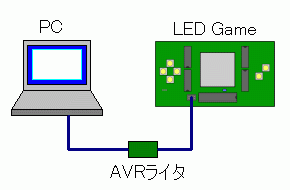 (2)パソコンとLEDゲームをAVRライタで接続します。